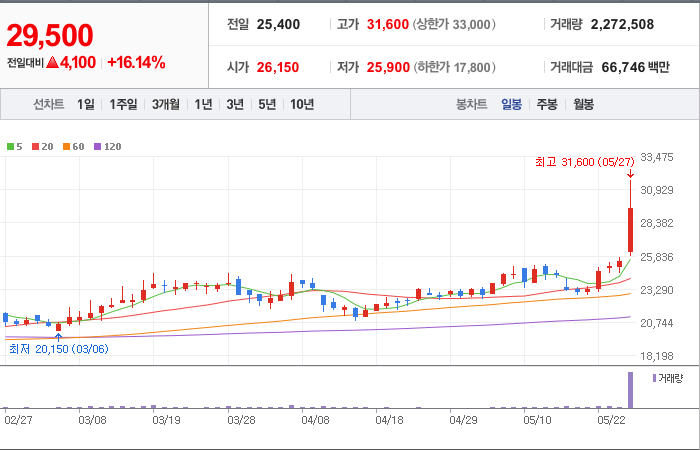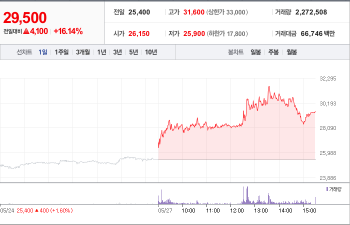 현재가: 29,500, 어제대비:+상승