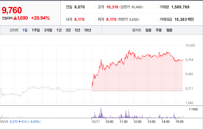 1,410시총: 581억원, 거래량:3,530,233, 거래대금:38,811백만