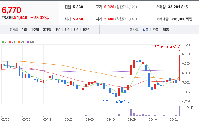 5,550시총: 2조 356억원, 거래량:2,760,134, 거래대금:116,877백만