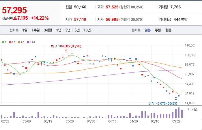 현재가: 57,295, 어제대비:+상승