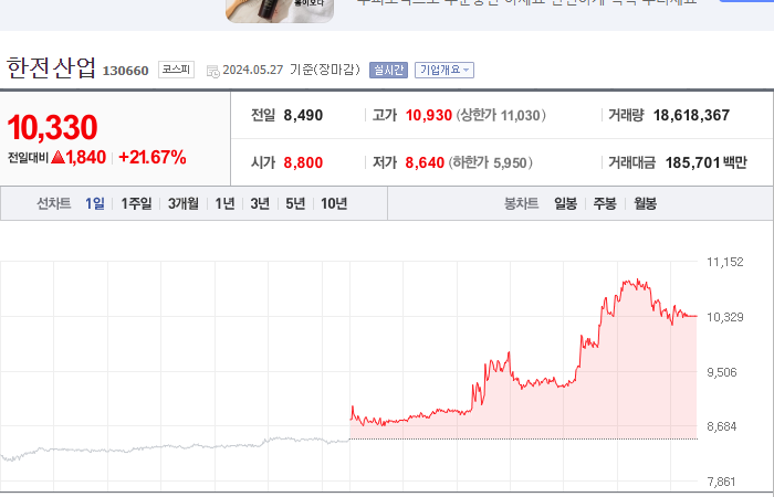 1. 한전산업 등락률: +21.67%