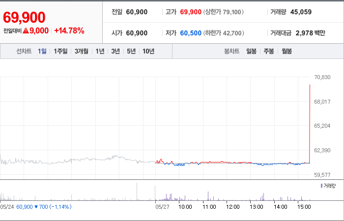 현재가: 69,900, 어제대비:+상승