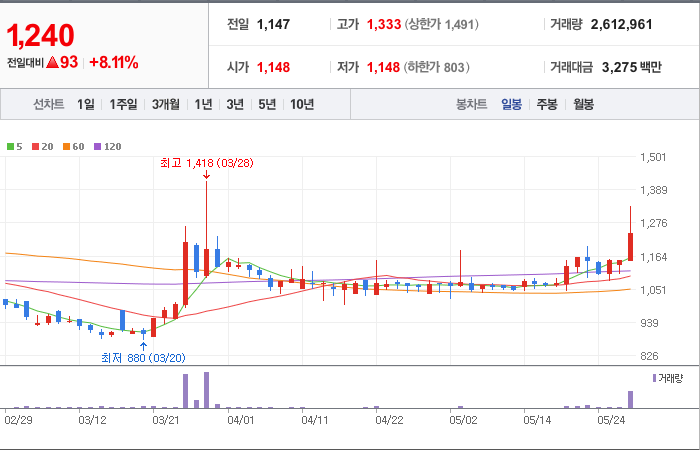 현재가: 1,240, 어제대비:+상승