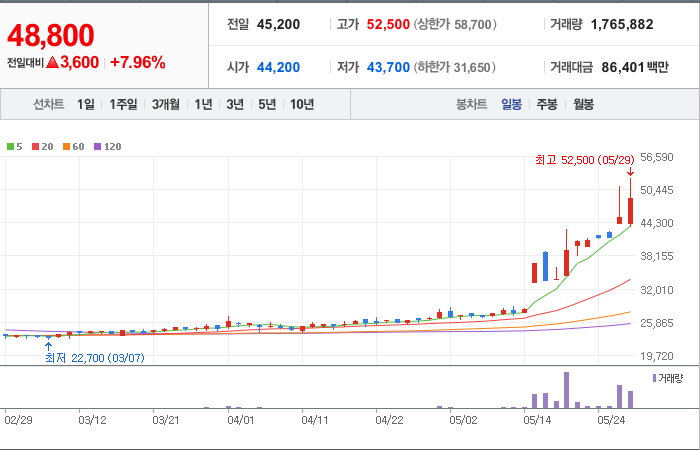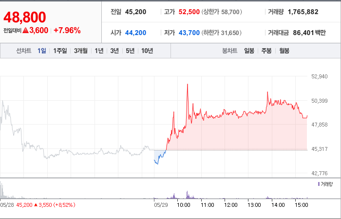 현재가: 48,800, 어제대비:+상승