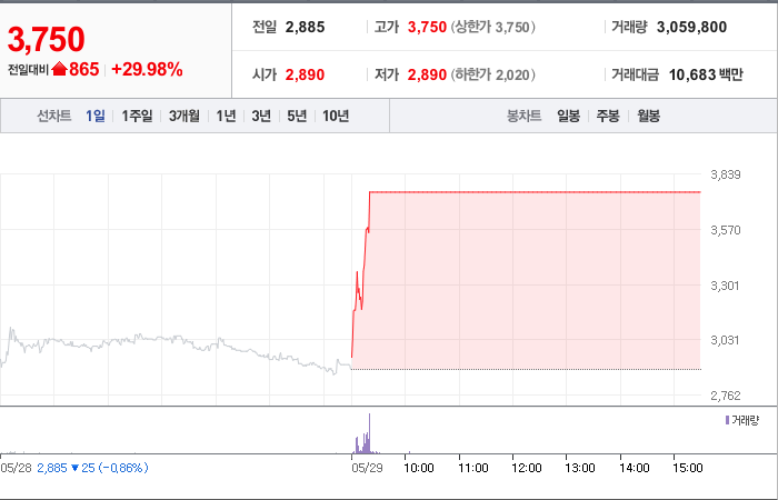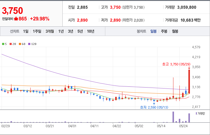 현재가: 3,750, 어제대비:+상한가