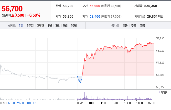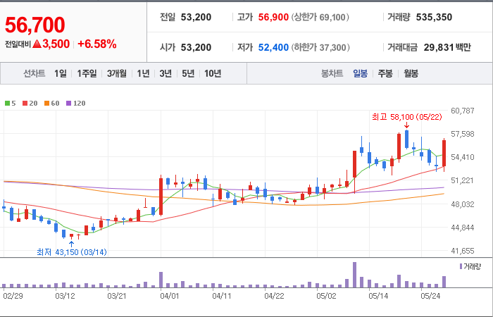 현재가: 56,700, 어제대비:+상승