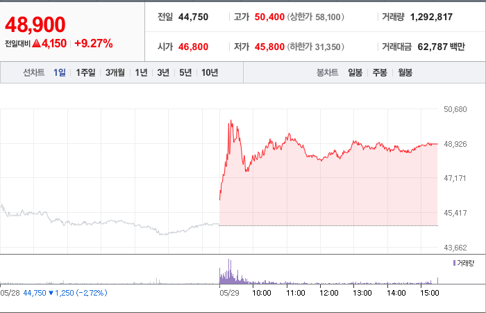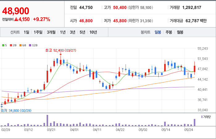 현재가: 48,900, 어제대비:+상승