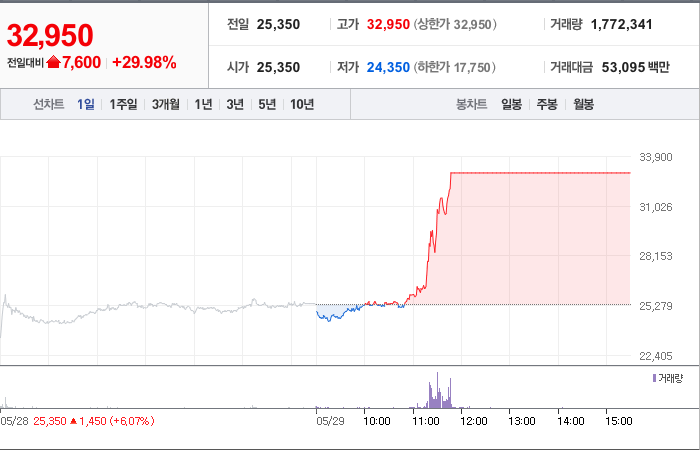 현재가: 32,950, 어제대비:+상한가