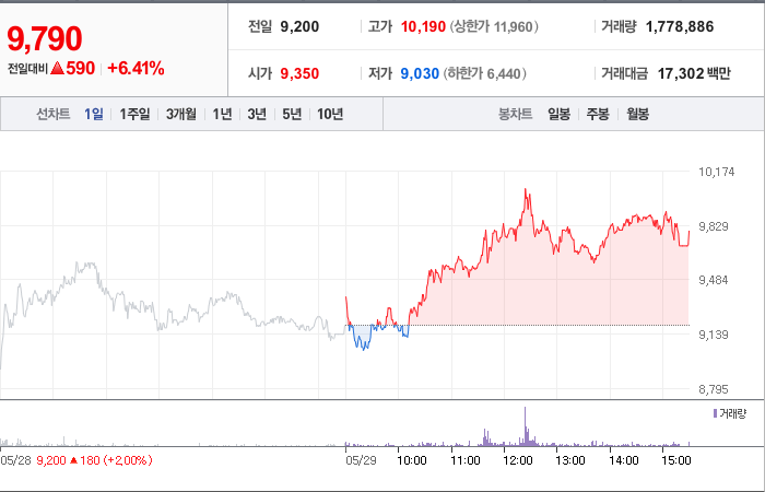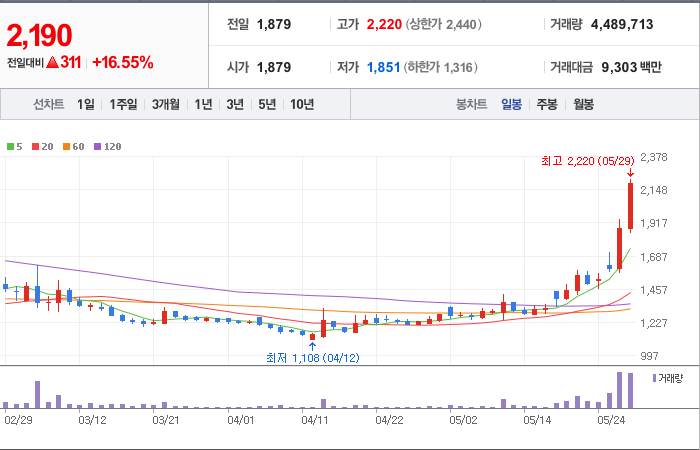 현재가: 2,290, 어제대비:+상한가