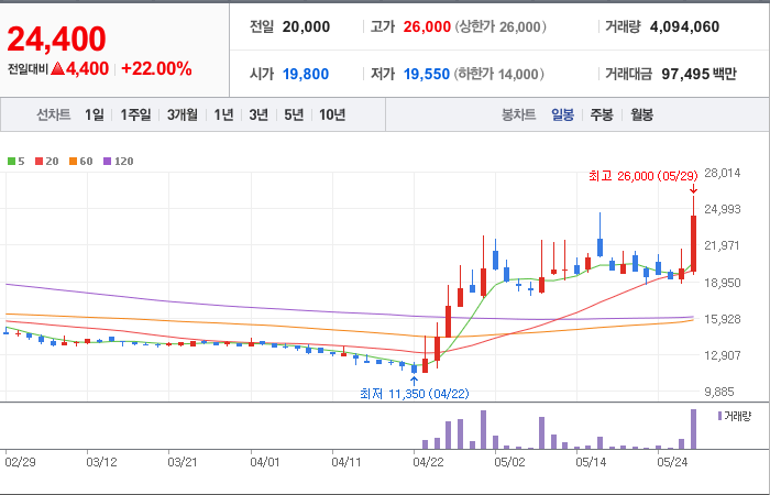 4,400시총: 862억원, 거래량:4,094,060, 거래대금:97,495백만