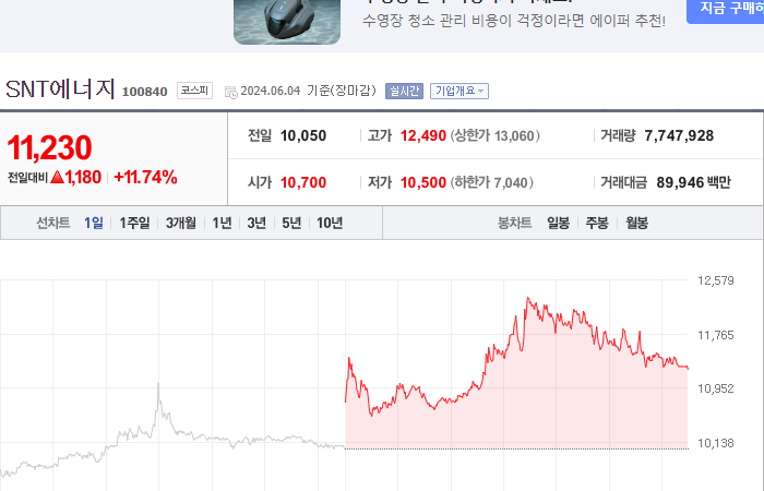 9. SNT에너지 등락률: +11.74%