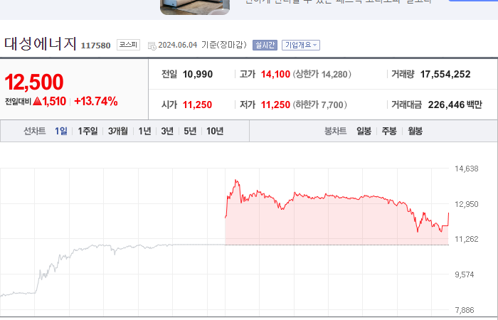 8. 대성에너지 등락률: +13.74%