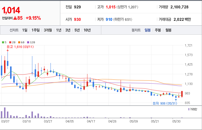 1,180시총: 2,322억원, 거래량:7,747,928, 거래대금:89,946백만