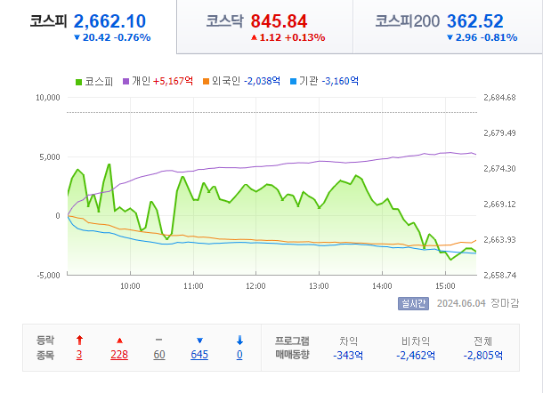 2024.06.04 16:56 / [시황] 코스피, 0.76% 소폭 하락 마감···알테오젠 17%↑-더팩트 / https://n.news.naver.com/mnews/article/629/0000293547