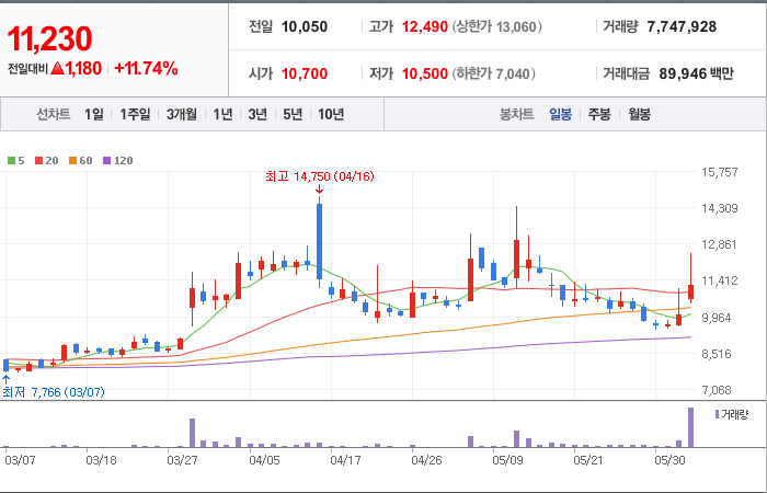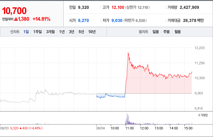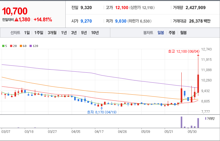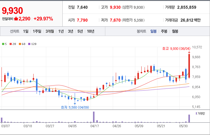 현재가: 9,930, 어제대비:+상한가