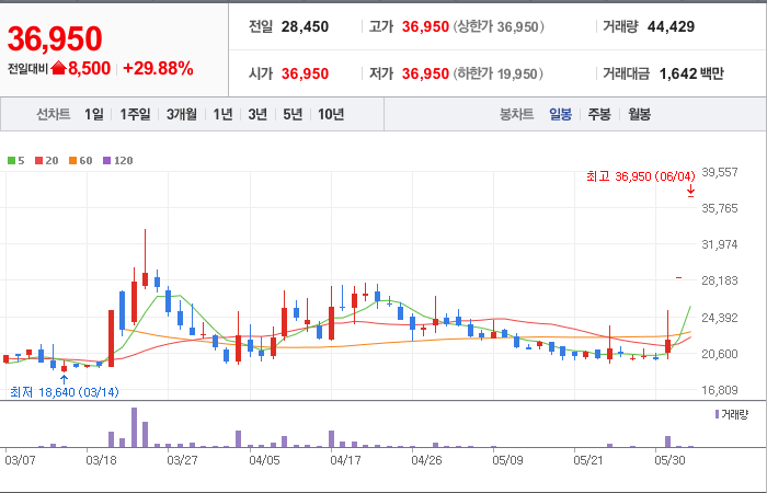 현재가: 36,950, 어제대비:+상한가