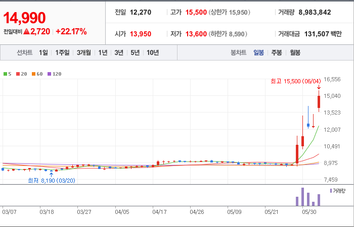현재가: 14,990, 어제대비:+상승