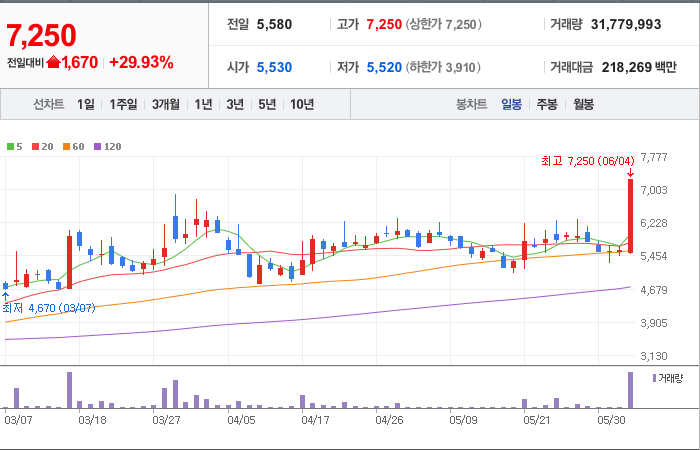 현재가: 7,250, 어제대비:+상한가