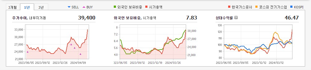 2024년 3월 전년동기 대비 연결기준 매출액은 28.6% 감소, 영업이익은 56.6% 증가, 당기순이익은 204.9% 증가. 평균기온 상승으로, 또 경기침체로 인한 산업용 민수용 수요가 감소하였으며 총 발전량 감소 및 민간 직수입 LN G 발전 증가로 판매수요 감소. 운전자금 및 차입금 평잔 감소로 이자비용이 감소하였으며 KORAS 등 관계기업투자지분 이익 증가하여 당기순이익 전년동기대비 증가.