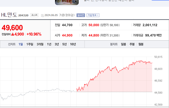 2024.06.05 14:16 / HL만도, 주가 5만원 눈앞…기관·외인 매수에 11%대 급등-머니투데이 / https://n.news.naver.com/mnews/article/008/0005047147