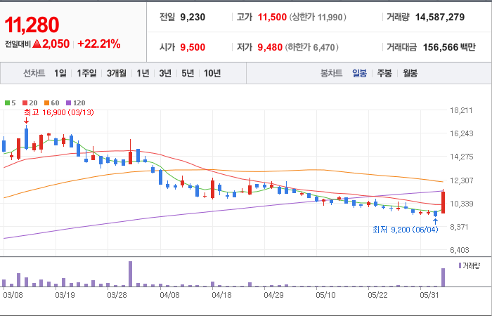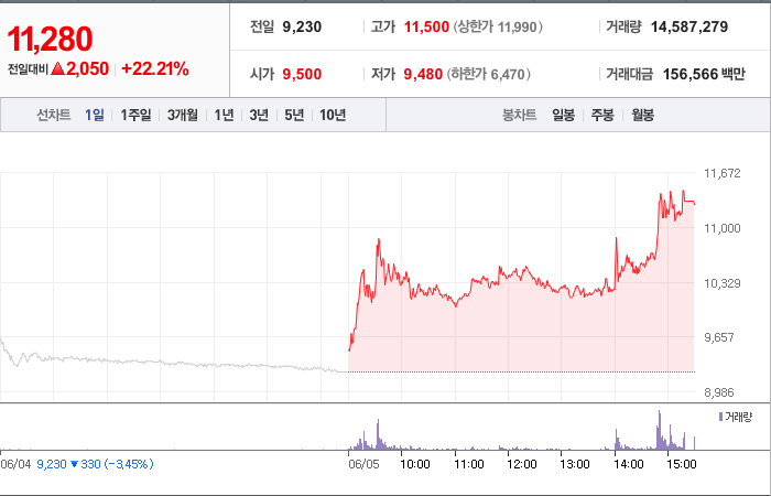 11,700시총: 6조 5,881억원, 거래량:3,874,837, 거래대금:364,765백만