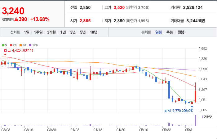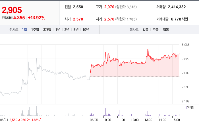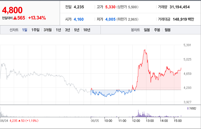 4,900시총: 2조 3,291억원, 거래량:2,061,112, 거래대금:99,470백만