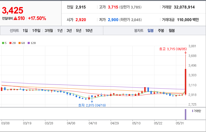 510시총: 3,696억원, 거래량:32,078,914, 거래대금:110,000백만
