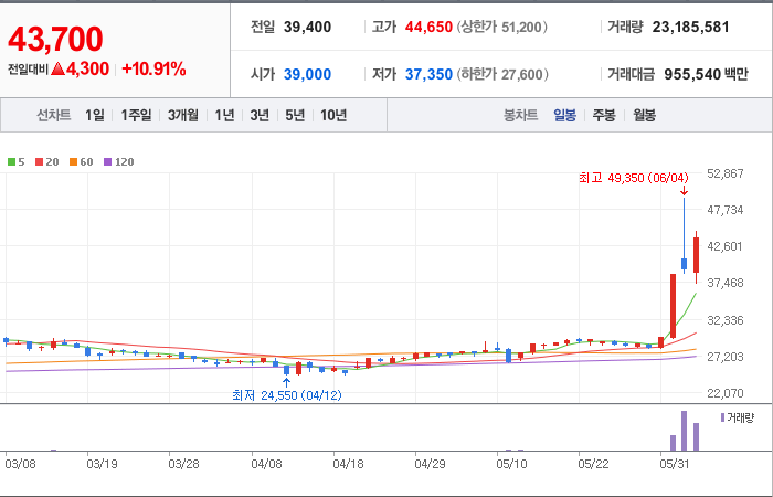 4,300시총: 4조 341억원, 거래량:23,185,581, 거래대금:955,540백만