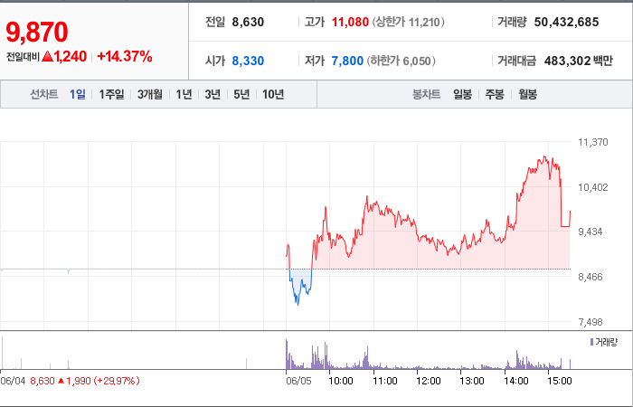 1,240시총: 1,028억원, 거래량:50,432,685, 거래대금:483,302백만