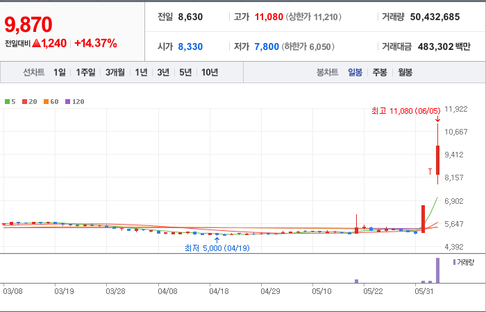 5,150시총: 1조 4,286억원, 거래량:906,335, 거래대금:48,747백만
