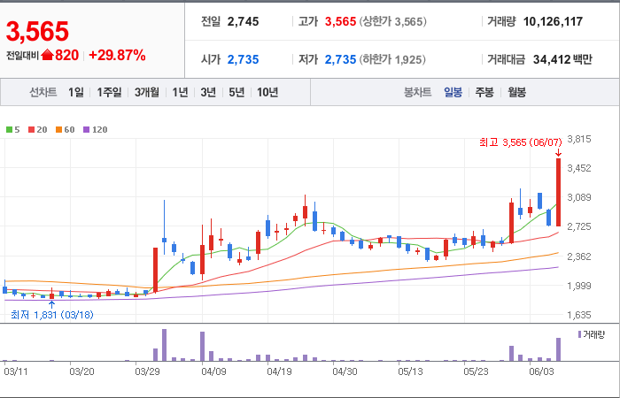 현재가: 3,565, 어제대비:+상한가