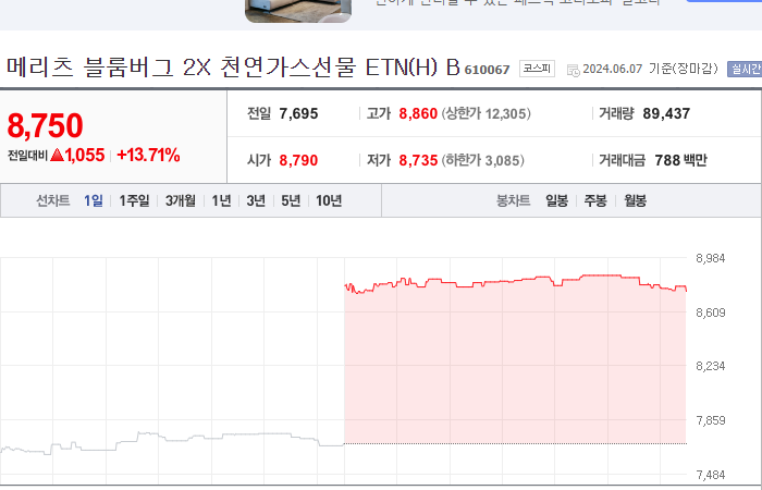 7. 메리츠 블룸버그 2X 천연가스선물 ETN(H) B 등락률: +13.71%