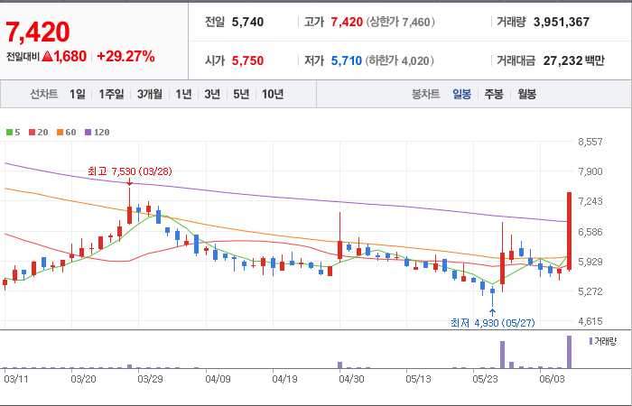 7,350시총: 3,625억원, 거래량:3,095,557, 거래대금:120,458백만