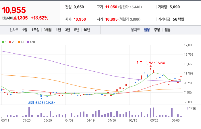 현재가: 10,955, 어제대비:+상승