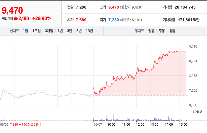 현재가: 9,470, 어제대비:+상한가