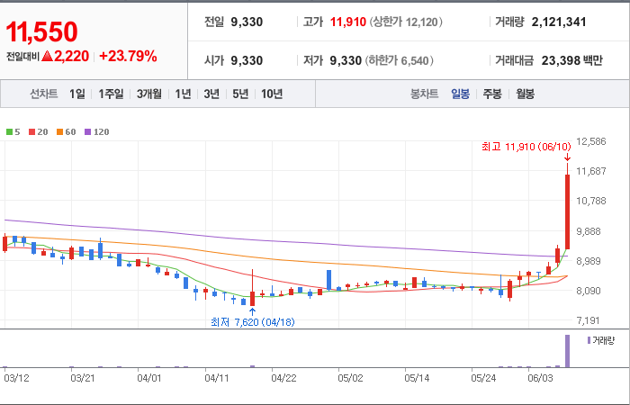 2,220시총: 1,219억원, 거래량:2,121,341, 거래대금:23,398백만