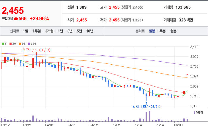 2,850시총: 4,026억원, 거래량:16,721,493, 거래대금:186,492백만