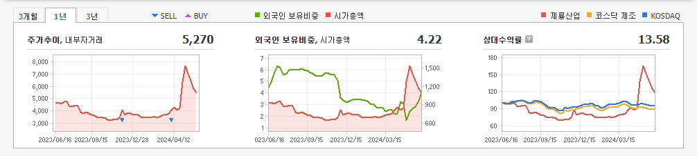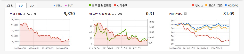 2024년 3월 전년동기 대비 별도기준 매출액은 1.2% 감소, 영업손실은 154.2% 증가, 당기순이익 적자전환. 최근 지속적인 연구개발 투자 및 인증을 통한 제품 경쟁력 강화로 수익성 개선 기대감으로 장기 바닥권에서 주가가 상승전환을 시도함. 내년 하반기부터는 유럽 및 기타지역에서 제품을 출시할 것으로 추정되며, 2025년 상반기에는 북미 시장 출시가 기대됨.