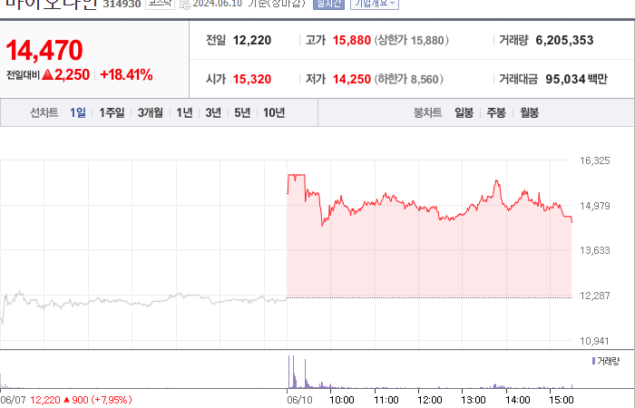2024.06.10 09:38 / "숨은 알짜, 시총 8000억 간다"…바이오다인 주가 폭등-한국경제 / https://n.news.naver.com/mnews/article/015/0004994799