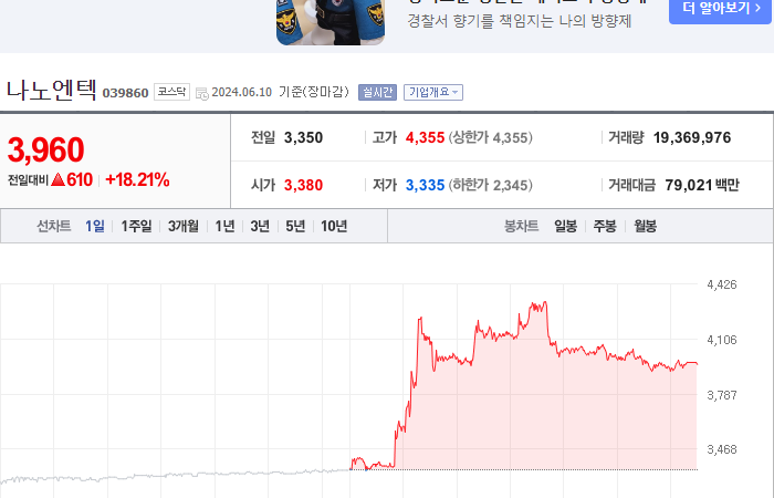19. 나노엔텍 등락률: +18.21%