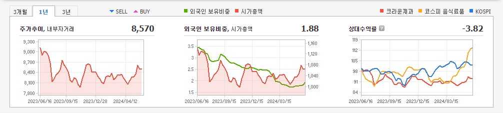2024년 3월 전년동기 대비 연결기준 매출액은 3.3% 증가, 영업이익은 61.9% 증가, 당기순이익은 118.1% 증가. (주)크라운제과와의 영업망을 공유하면서 영업소 감축에 따른 운영인력 감소, 영업사원의 고객대응력 개선, 고객점의 거래기반 확대 등을 통해서 영업수익성 개선효과가 발생함. 점진적인 원재료 수급 안정화와 신공장 준공 등을 통한 경영효율화로 상기와 같은 경영실적을 달성함.