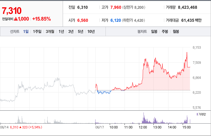 1,000시총: 1,287억원, 거래량:8,423,465, 거래대금:61,435백만
