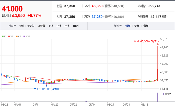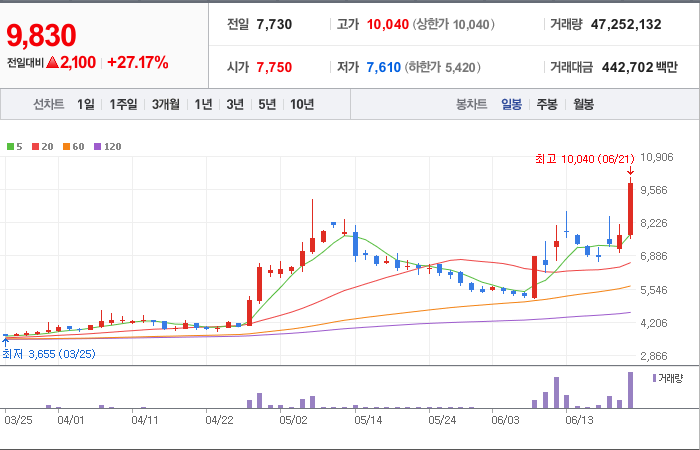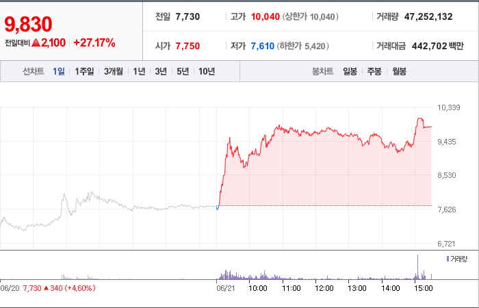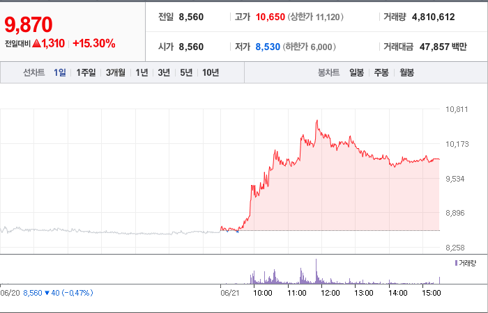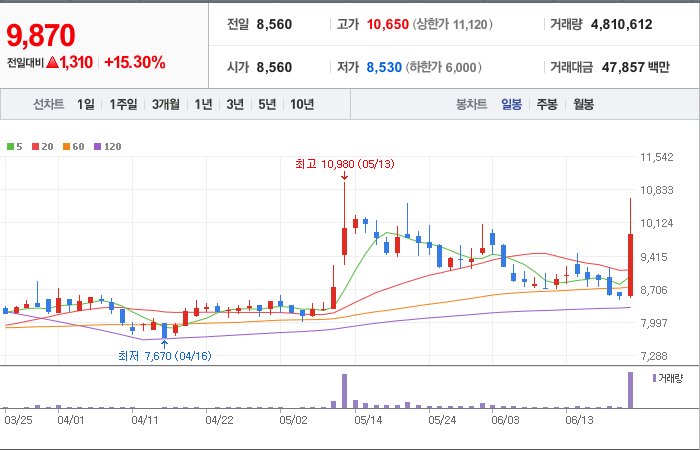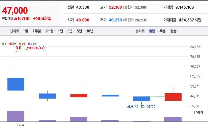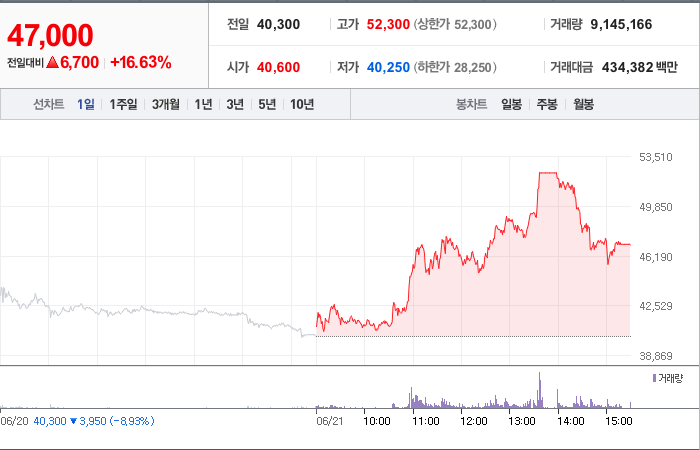 6,700시총: 3,733억원, 거래량:9,145,166, 거래대금:434,382백만