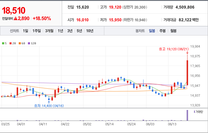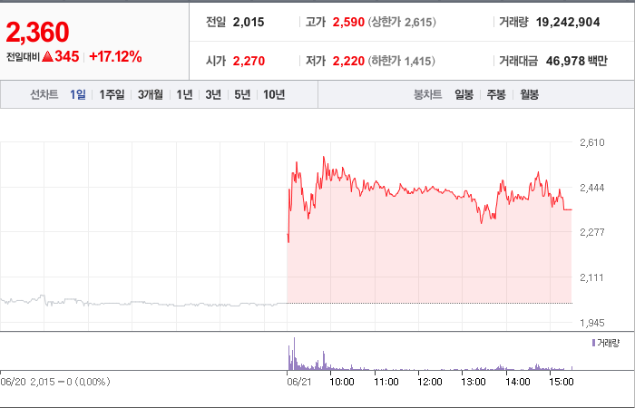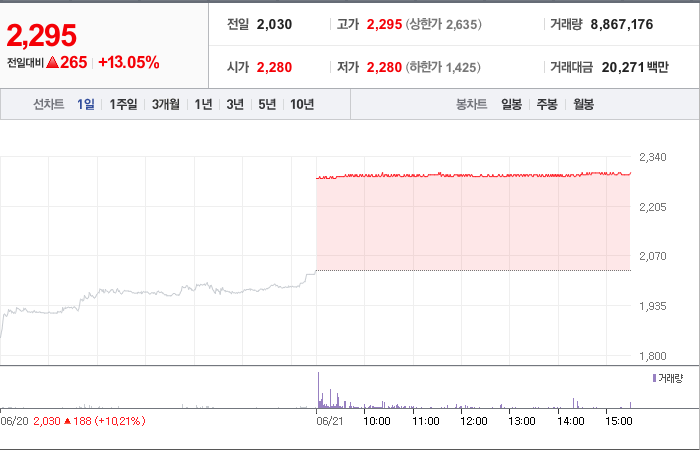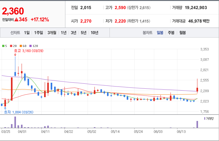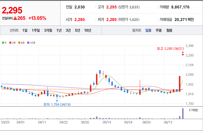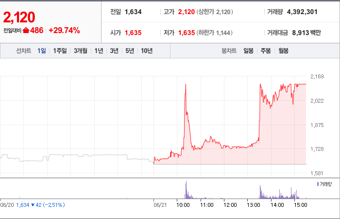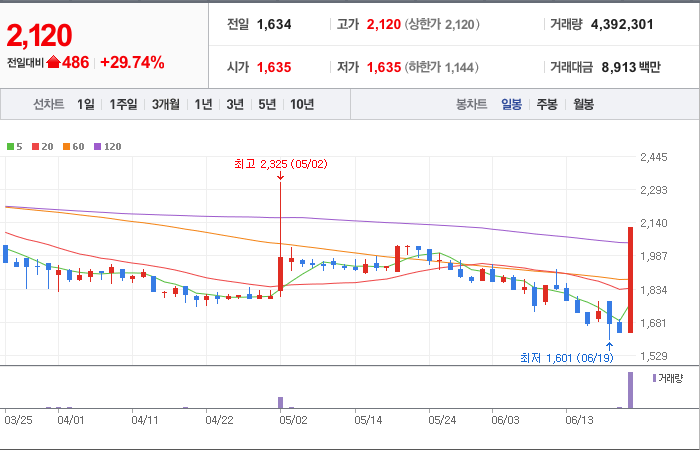현재가: 2,120, 어제대비:+상한가