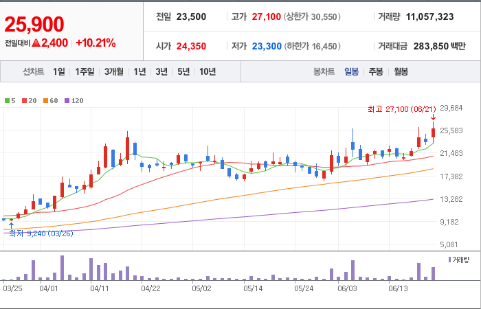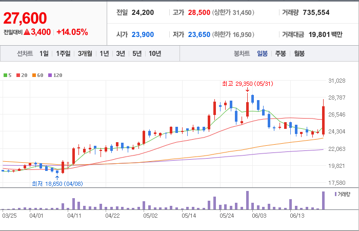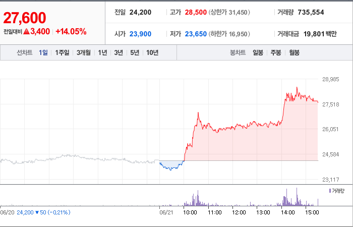 현재가: 27,600, 어제대비:+상승