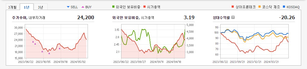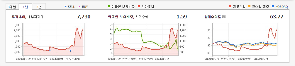 2024년 3월 전년동기 대비 연결기준 매출액은 15.5% 감소, 영업손실은 15.8% 감소, 당기순이익 흑자전환. 동사는 최근 3년 중 가장 저조한 매출 실적을 기록함. 전년동기 대비 영업손실이 감소되었지만 최근 상승하던 모습을 멈춤. 이에 따라 PER는 33배에서 5.5배로 감소하였으며 업종 대비 저PER 종목임. LCD 산업의 경기 침체 지속으로 스마트폰과 가전의 수요가 줄어들고있고 원재료값 상승으로 수익성이 악화 지속됨.