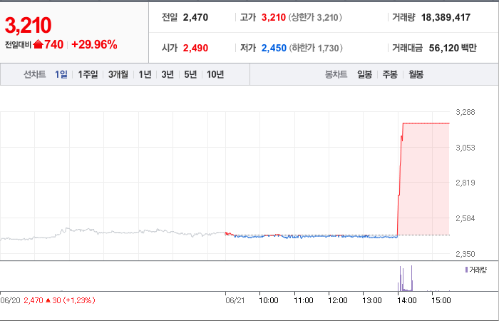 현재가: 3,210, 어제대비:+상한가