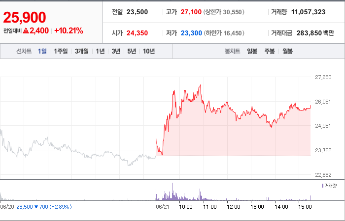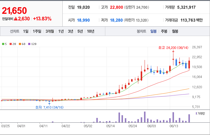 현재가: 21,650, 어제대비:+상승