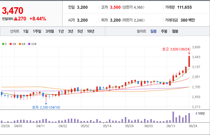 현재가: 3,460, 어제대비:+상승