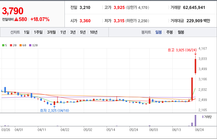 625시총: 92억원, 거래량:223, 거래대금:2백만